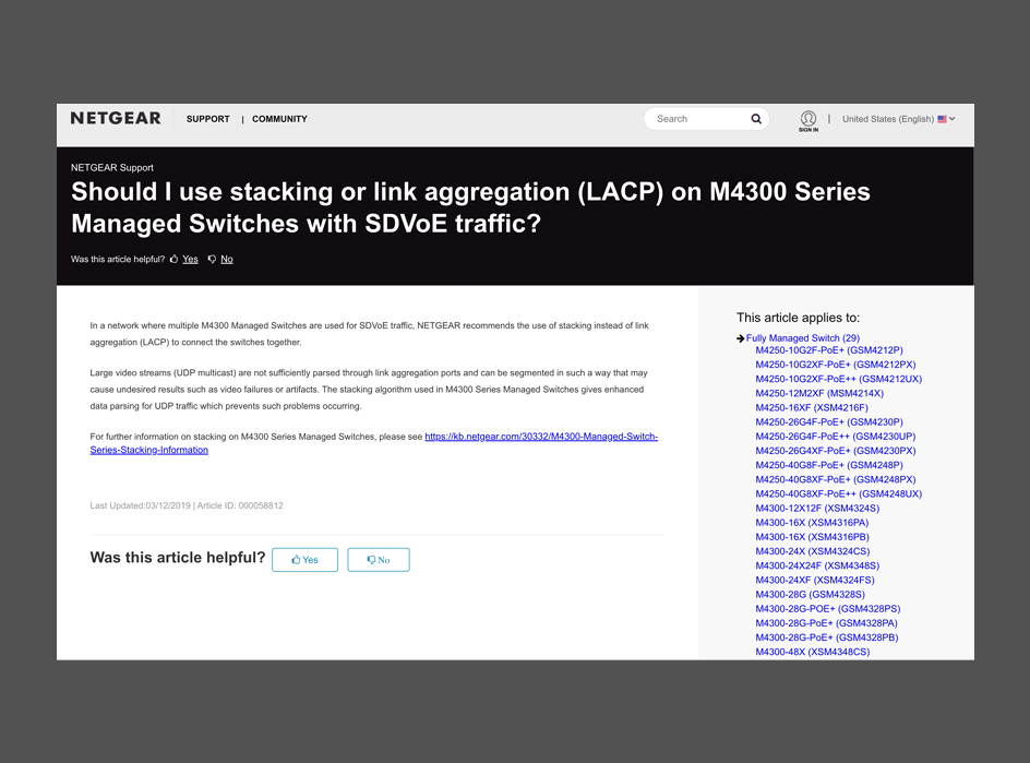 Dois-je utiliser le stack ou l'agrégation de liens (LACP) sur les switches manageable de la série M4300 pour la SDVoE ?